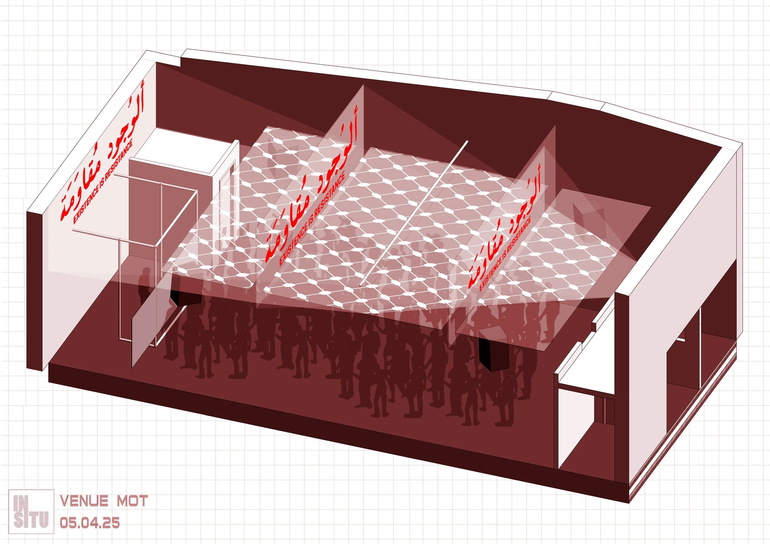 In Situ were approached by Raji Rags to provide an installation as part of a fundraiser clubnight in support of the Palestinian Al Rowwad Arts Center. Due to the nature of the fundraiser we sought to create an installation as resourcefully as possible, using black scaffolding mesh as our translucent screen material, which then we could projection map the artwork by DIY Worldwide. The event managed to raise over £1600 for the organisation.